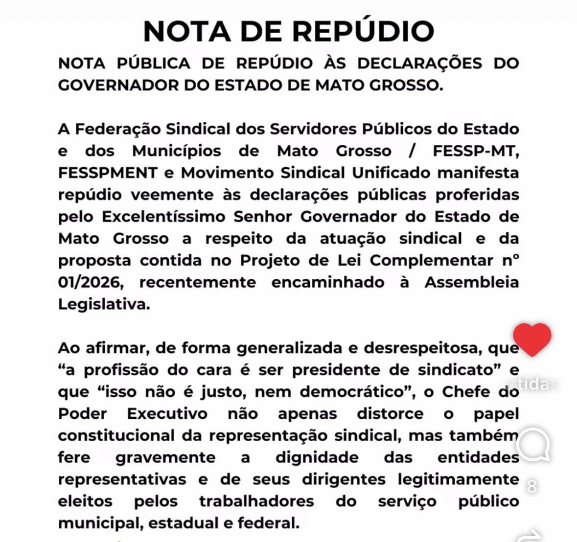 Movimento Sindical Unificado repudia declarações do governador e critica PLC 01/2026