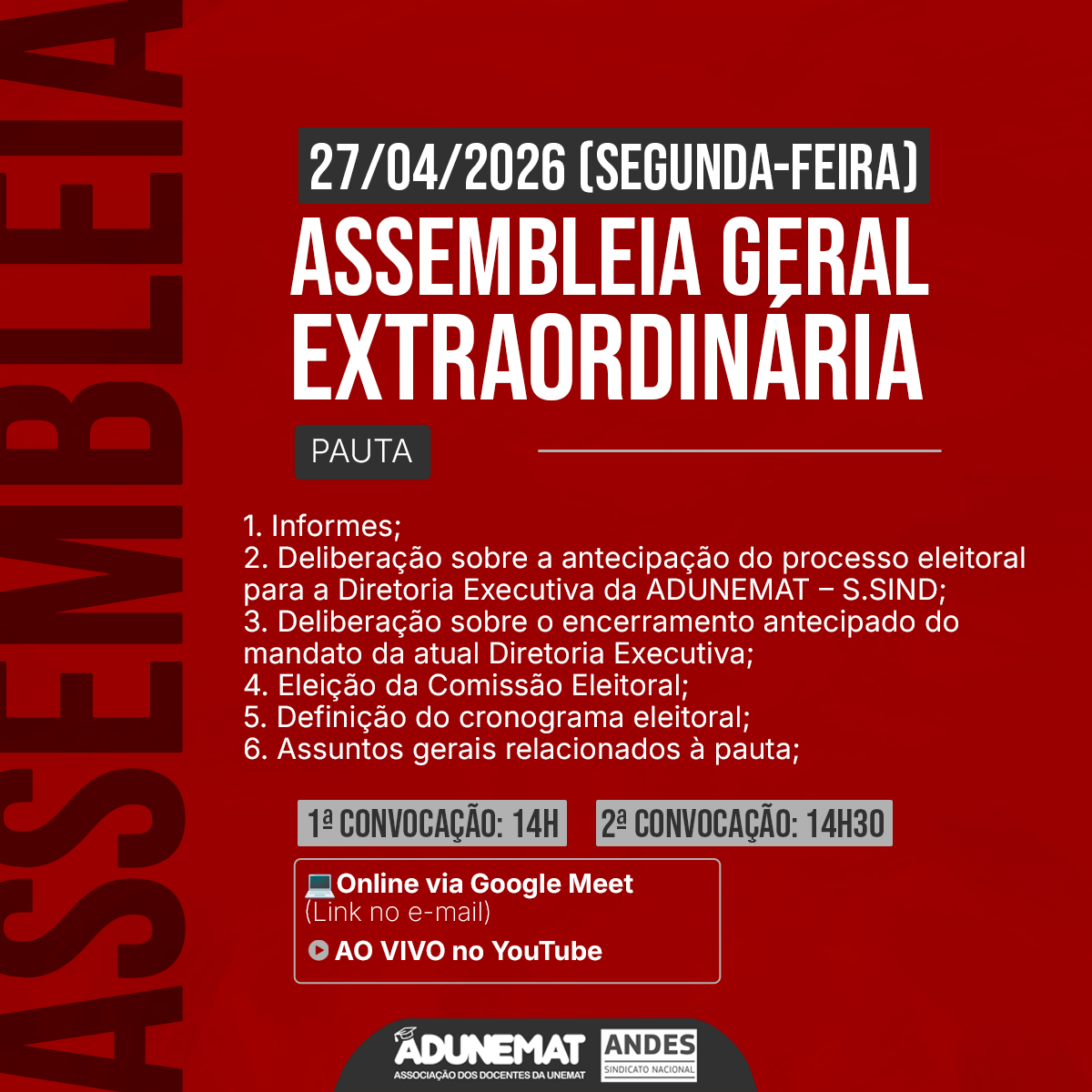 ADUNEMAT convoca Assembleia Geral Extraordinária para o dia 27 de abril, às 14h, online, para