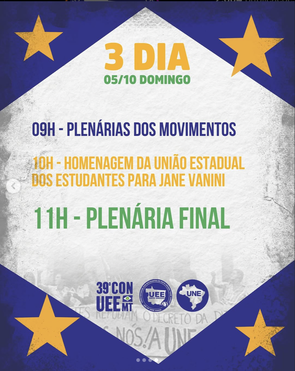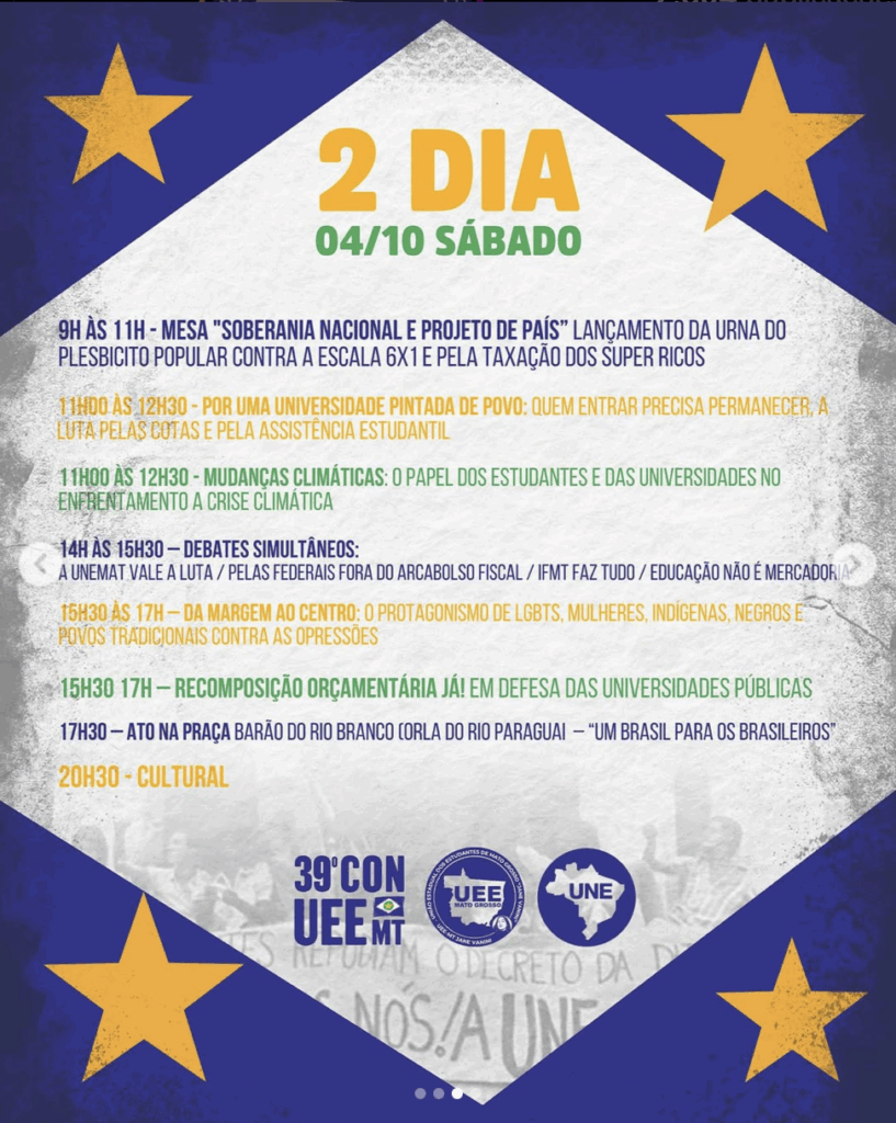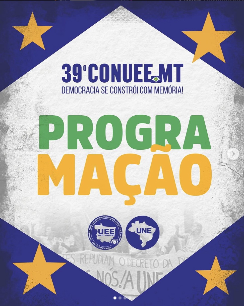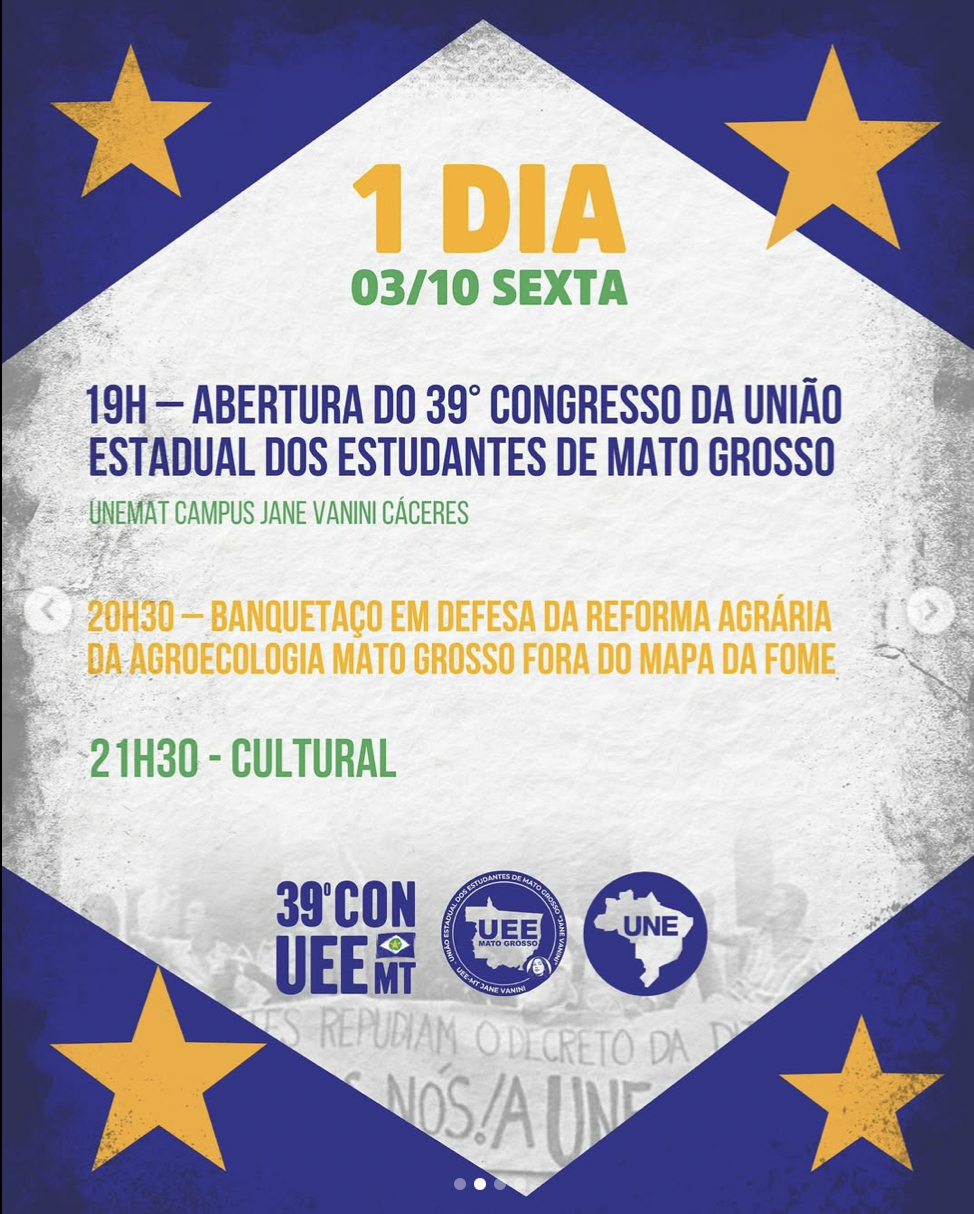- 19h00 – Abertura do 39° Congresso da União Estadual dos Estudantes de Mato Grosso
