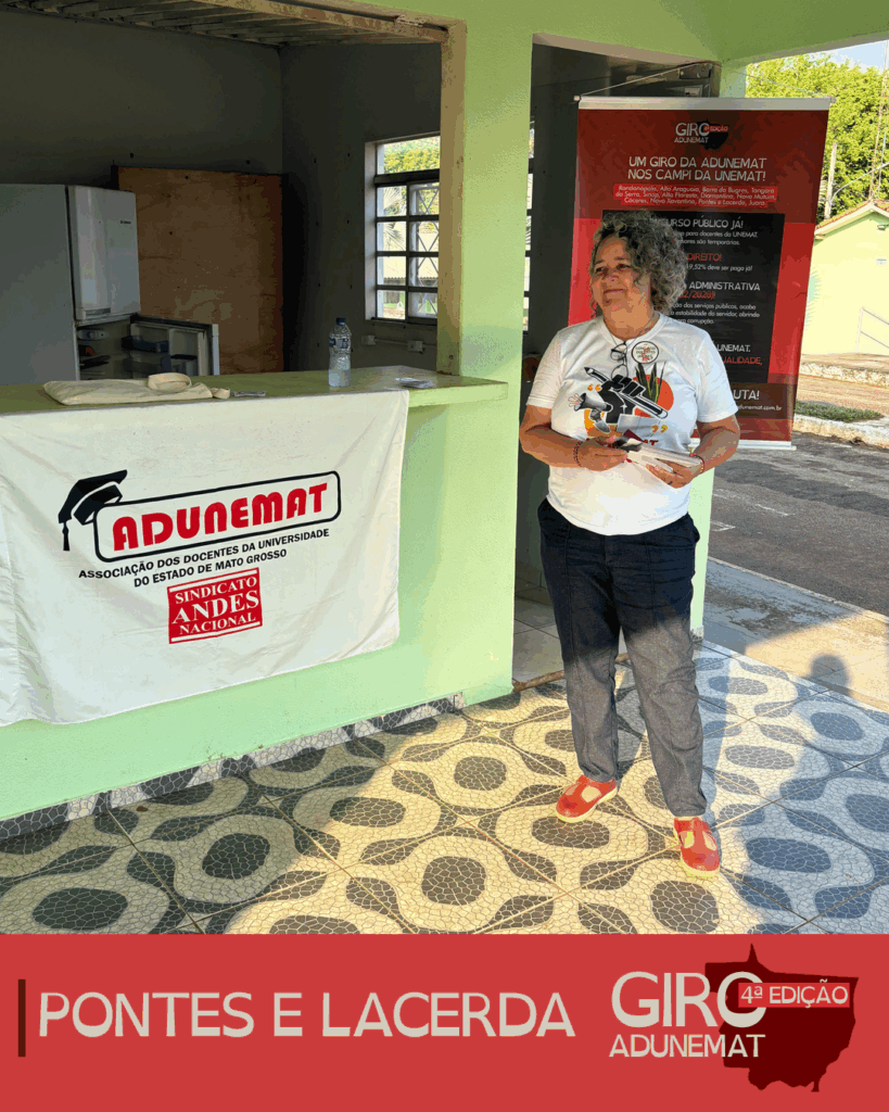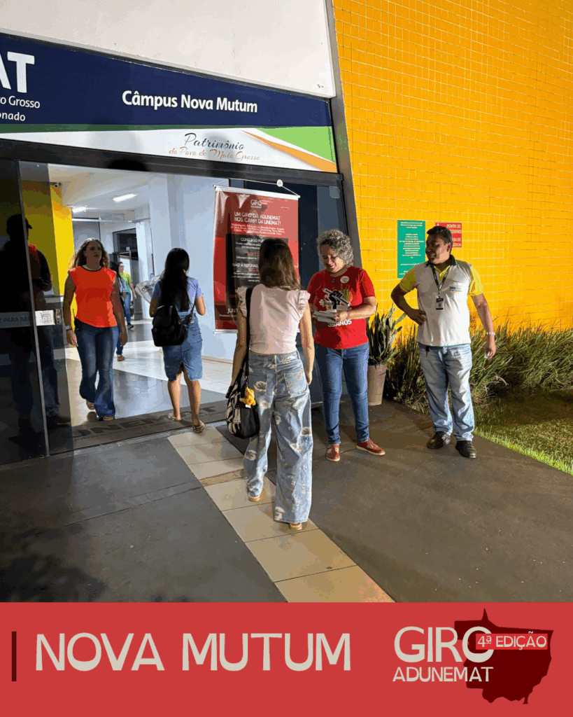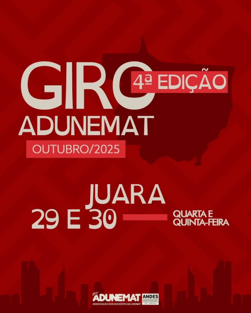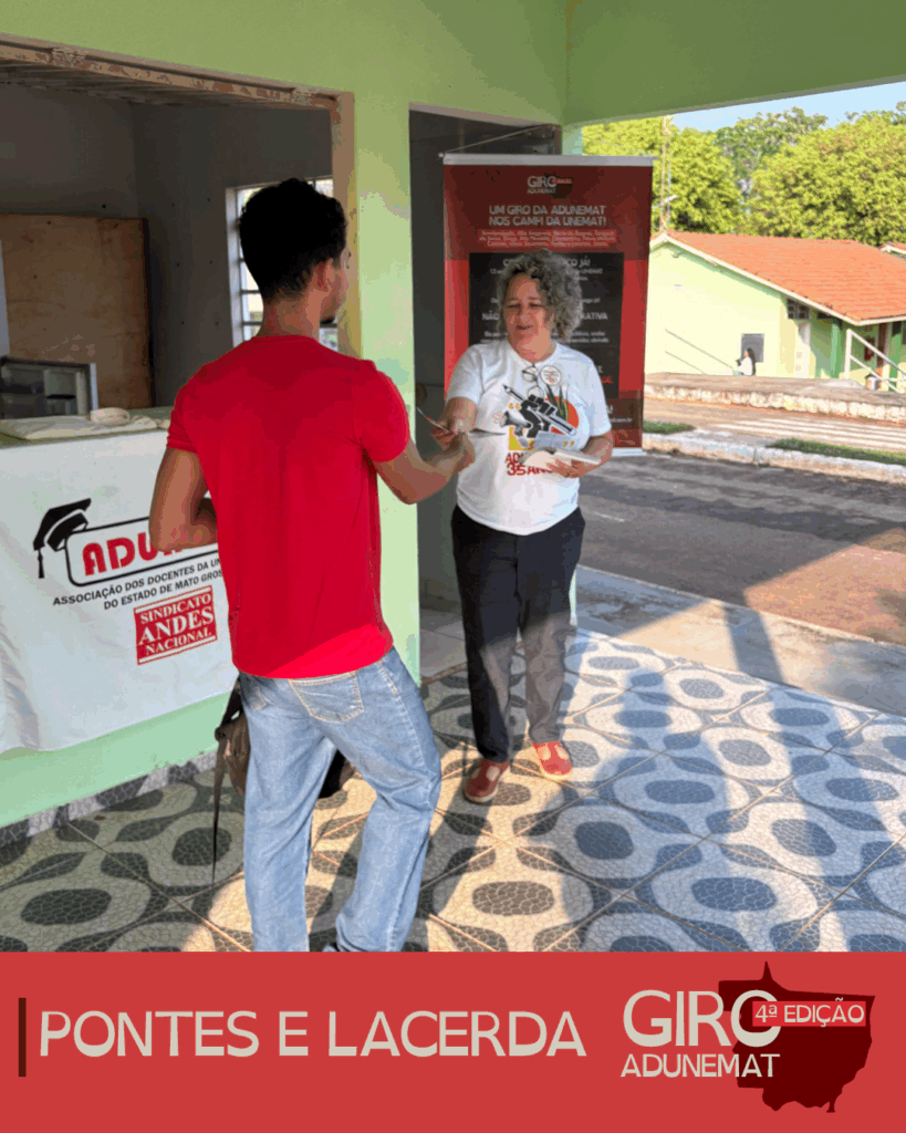 A ADUNEMAT (Associação dos Docentes da Universidade do Estado de Mato Grosso), Seção Sindical do ANDES-SN, encerra nos dias 29 e 30 de outubro a 4ª edição do Giro ADUNEMAT, com visita ao campus da UNEMAT em Juara. A atividade marca o fim de uma jornada que percorreu 11 cidades desde setembro — e que, ao todo, somará 12 campi visitados em todo o estado.