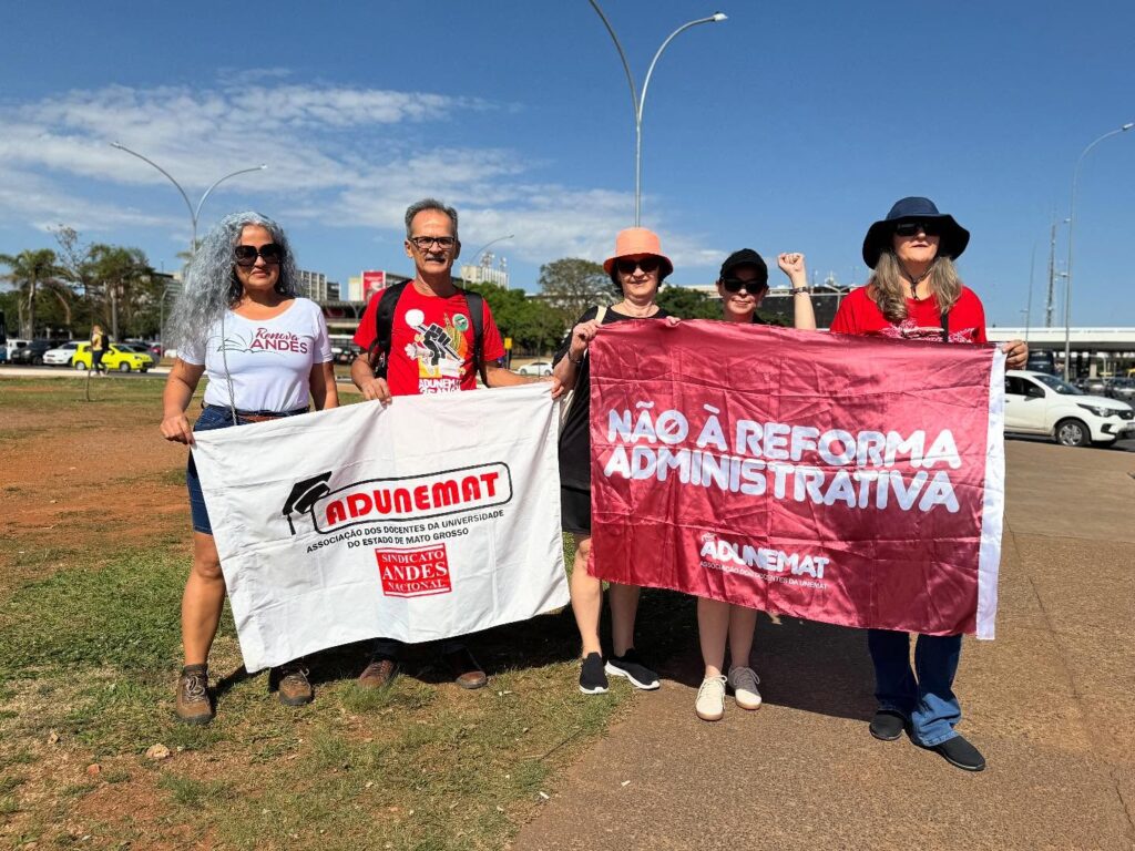 A ADUNEMAT – Seção Sindical do ANDES-SN, Sintep, Sisma, Sintesmat, Sinasefe-MT, entre outros participaram da mobilização integrando uma caravana que saiu de Mato Grosso, composta por quatro ônibus. Durante a marcha, as falas destacaram os impactos da PEC 38/2025, que propõe mudanças profundas no serviço público, afetando servidores e servidoras de todas as esferas.