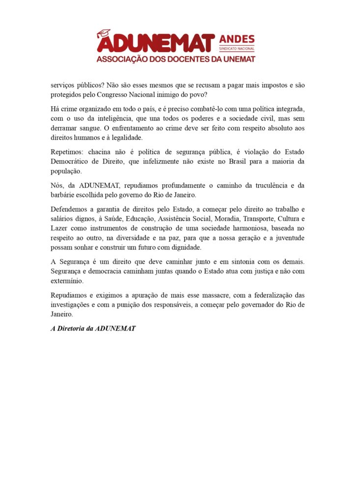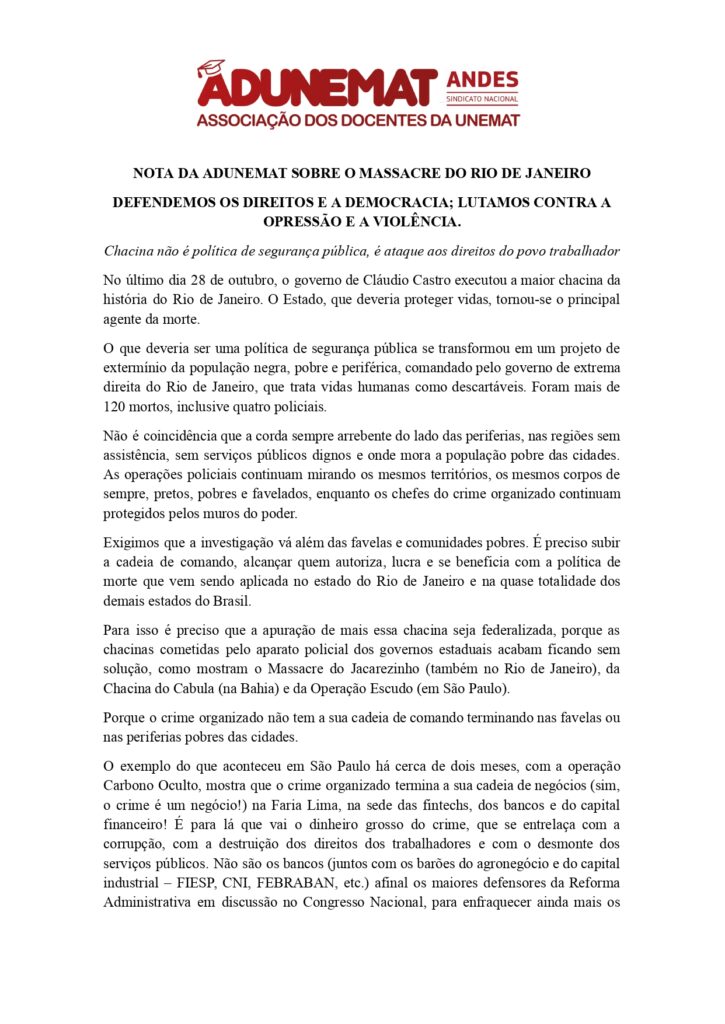 A Associação dos Docentes da Universidade do Estado de Mato Grosso (ADUNEMAT) publicou nesta sexta-feira (31) uma nota pública de repúdio ao que classificou como “a maior chacina da história do Rio de Janeiro”, ocorrida no último dia 28 de outubro, durante uma operação policial que deixou mais de 120 mortos, entre eles quatro agentes de segurança.