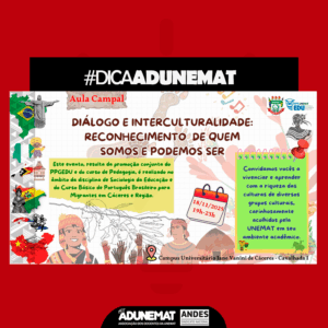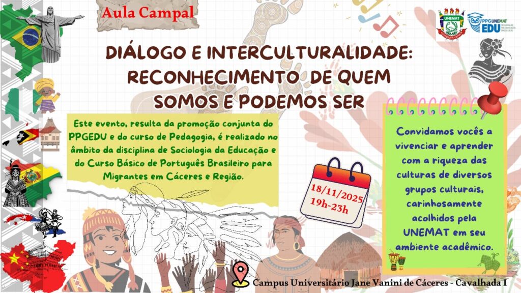 Nesta terça-feira, 18 de novembro, acontece a Aula Aberta “Diálogos e Interculturalidade: reconhecimento de quem somos e podemos ser”, no Pátio do Campus Universitário Jane Vanini, em Cáceres, das 19h às 23h. A atividade, que segue como uma DICA ADUNEMAT desta semana, reúne estudantes, docentes e convidados para dialogar sobre identidade, convivência e cooperação entre culturas que se encontram no espaço universitário.