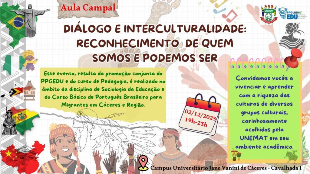 Nesta terça-feira, 02 de dezembro, acontece a Aula Campal “Diálogos e Interculturalidade: reconhecimento de quem somos e podemos ser”, no Pátio do Campus Universitário Jane Vanini, em Cáceres, das 19h às 23h. A atividade estava inicialmente marcada para o dia 18 de novembro, mas foi remarcada em razão do luto institucional na universidade. Reunindo estudantes, docentes e convidados para refletir sobre identidade, convivência e cooperação entre culturas presentes no espaço universitário, a aula é a DICA ADUNEMAT desta semana.