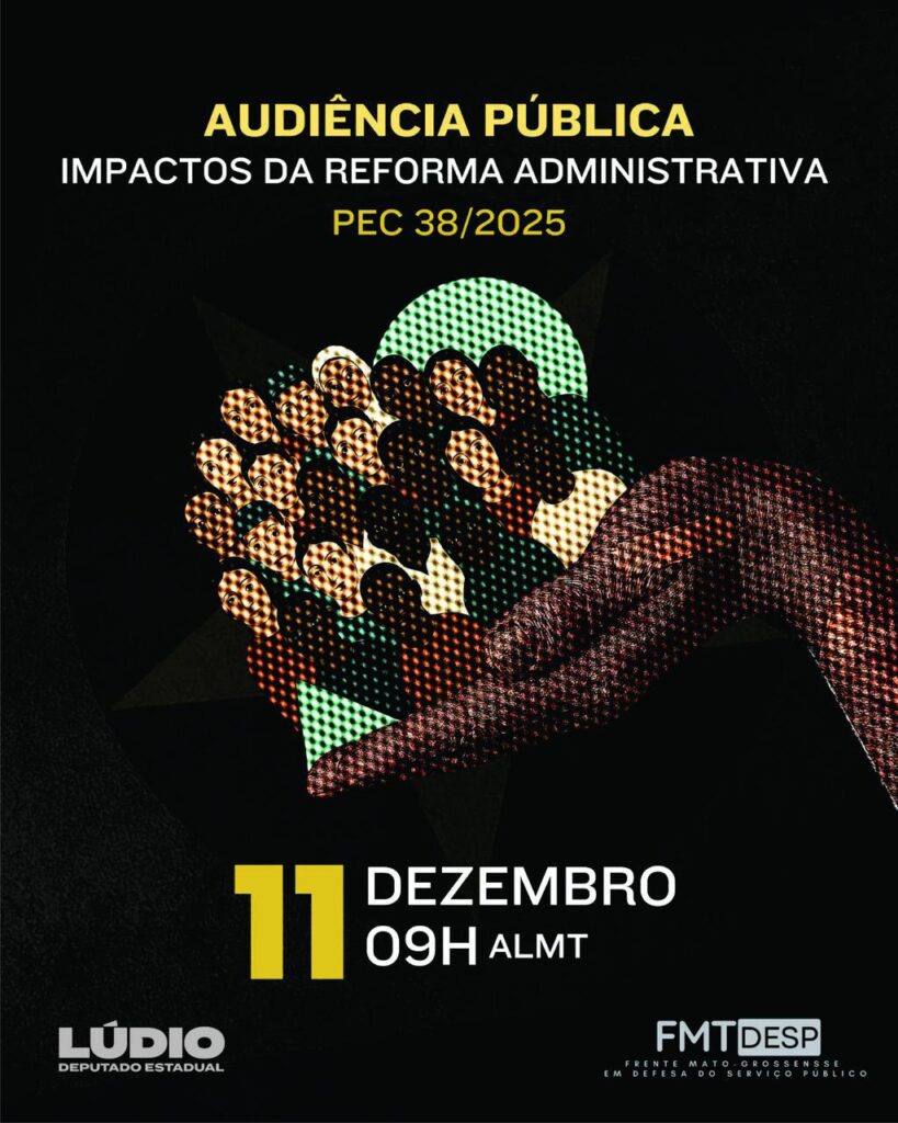 Em Mato Grosso, a luta das entidades e sindicatos do serviço público se fortalece com mais uma importante atividade de mobilização nesta quinta-feira, 11 de dezembro, às 9h: a Audiência Pública “Impactos da Reforma Administrativa – PEC 38/2025”, na Assembleia Legislativa de Mato Grosso (ALMT). A iniciativa foi convocada pelo deputado estadual Lúdio Cabral, a partir da demanda apresentada pela Frente de Entidades em Defesa dos Serviços Públicos.