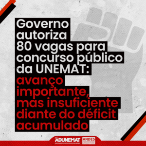 A ADUNEMAT S. Sindical do Andes-SN recebeu a informação imediatamente após o anúncio e avalia que a realização do certame é uma medida necessária. O avanço é resultado da mobilização permanente da categoria docente, que há mais de uma década denuncia a defasagem do quadro efetivo e a precarização das condições de trabalho, no entanto, o número autorizado contempla apenas parte das necessidades atuais da UNEMAT e evidencia a ausência de um compromisso efetivo do governo com a universidade.