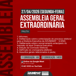 A ADUNEMAT – Seção Sindical do ANDES-SN convoca todos os docentes sindicalizados da Universidade do Estado de Mato Grosso (UNEMAT) para participarem de Assembleia Geral Extraordinária, que será realizada no próximo dia 27 de abril de 2026 (segunda-feira), às 14h, em primeira convocação.