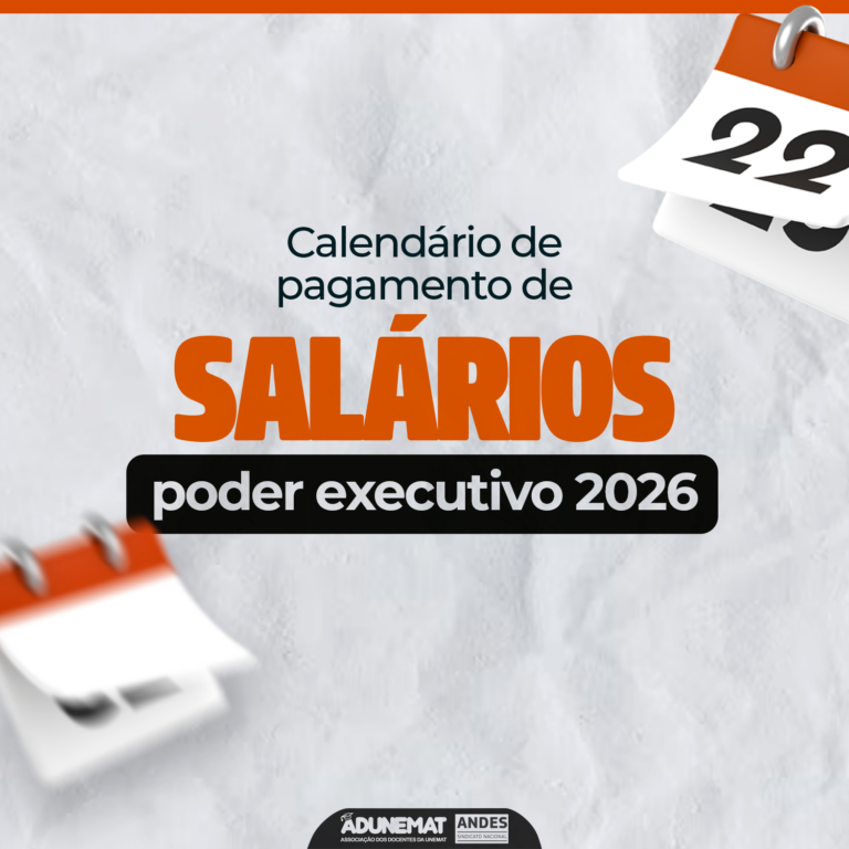 A ADUNEMAT (Associação dos Docentes da UNEMAT), Seção Sindical do ANDES-SN, informa às professoras e aos professores as datas do calendário de pagamento dos salários e do 13º salário dos servidores públicos estaduais para o ano de 2026, conforme divulgado…